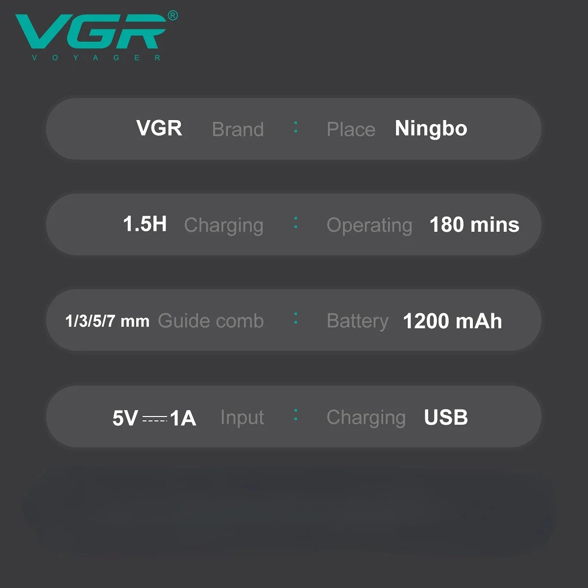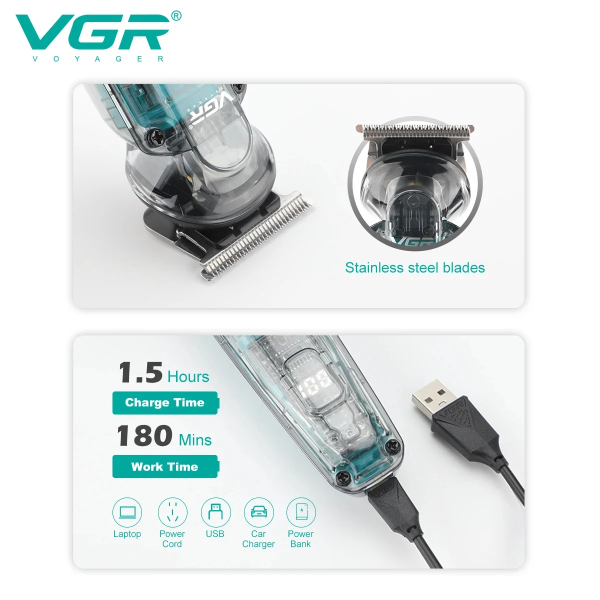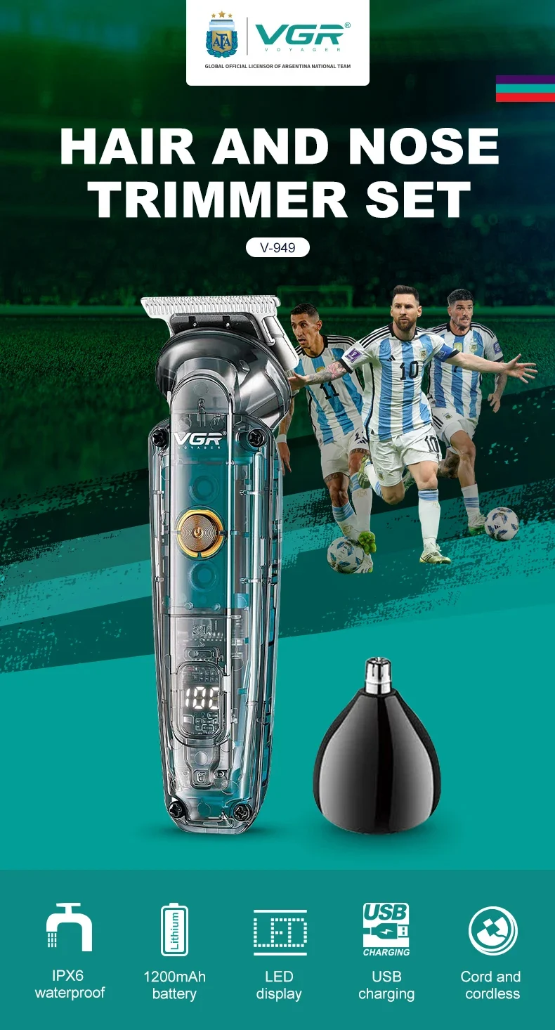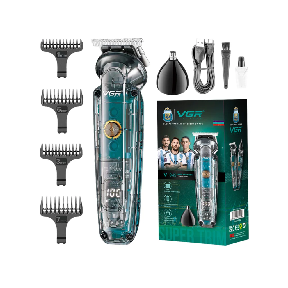 La máquina VGR V-949 es una patillera/recortadora 2 en 1 con cuchillas de acero inoxidable, batería recargable de 1200mAh para hasta 180 minutos de uso, certificación IPX6 de resistencia al agua, e incluye 4 peines guía. Es inalámbrica, con carga rápida en 1.5 horas, y cuenta con una pantalla digital LED para mostrar el nivel de la batería.